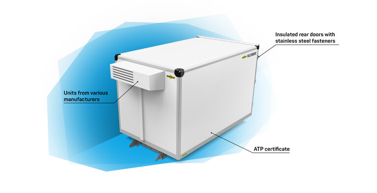 Whether its fresh or frozen goods, the Flexbox COOL AND FREEZE offers the right solution for every type of sensitive cargo. To protect the front and side walls, a 150-mm-high aluminium scuff plate is installed in the interior