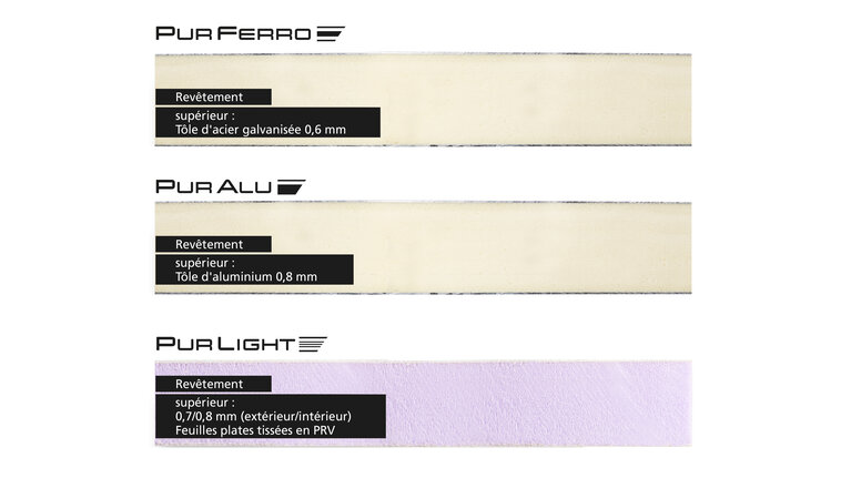 - En option, les panneaux sandwich peuvent être dotés d’un revêtement en tôle d’acier galvanisée robuste et facile à entretenir (PurFerro, épaisseur 0,6 mm).